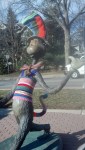 Somebody thought our cat in the hat was cold so now he has a warm hat, a sweater vest, and a tail warmer.