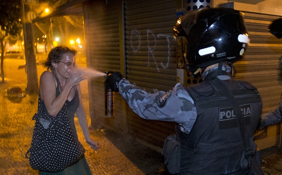 A military police peper sprays a protester during a demonstration in Rio de Janeiro, Brazil, Monday, June 17, 2013. Protesters massed in at least seven Brazilian cities Monday for another round of demonstrations voicing disgruntlement about life in the country, raising questions about security during big events like the current Confederations Cup and a papal visit next month. ((AP Photo/Victor R. Caivano)