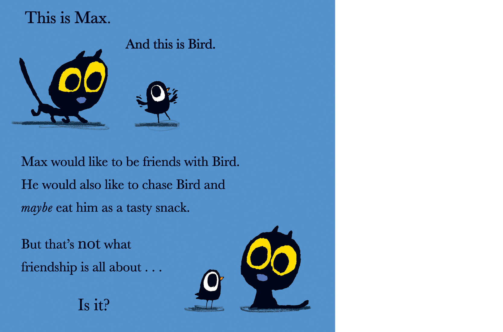 I have not had the pleasure of reading Max and the Bird, but the Amazon summary for it is: “When Max meets Bird, Max thinks he’d like to be friends with Bird. He would also like to chase Bird and maybe eat him as a tasty snack. But that’s not what friendship is all about . . . Is it?”